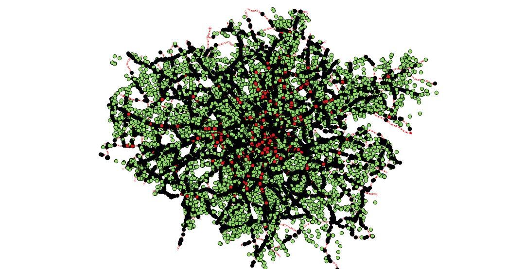 Categorising cycle collisions - green are non A road, black are A road sections without a bus lane, red are A road sections where a bus lane is present.